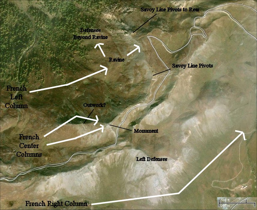 battalions. On the map, the Savoy army entrenchments are in red. The French right column of 14 battalions under the command of Marshal Villemur swung wide to the right and around much of the enemy position to attack it on another section of the mountain. The effort failed. On the map this is the column on white troops on the bottom. The French left column of 9 battalions under General Mailly was to move through a ravine and attack the enemy position. The French center column of 8 battalions under Marshal d'Arnaud was to attack the salient to their front. At 4:30, the French attacked. A site from which came the four French columns B first column C two columns of the center E French battery F entrenchment of the hill 'Assietta G attack on grenadier guards. Belle Isle and d'Arnaud killed I -K reduced defense volunteers P Austrian Colloredo and Casale Piedmontese Q entrenchment defended by the regiment of grenadier guards R Hungarian battalion Forgatz S Austrian Traun Battalion T Swiss battalion Meyer |