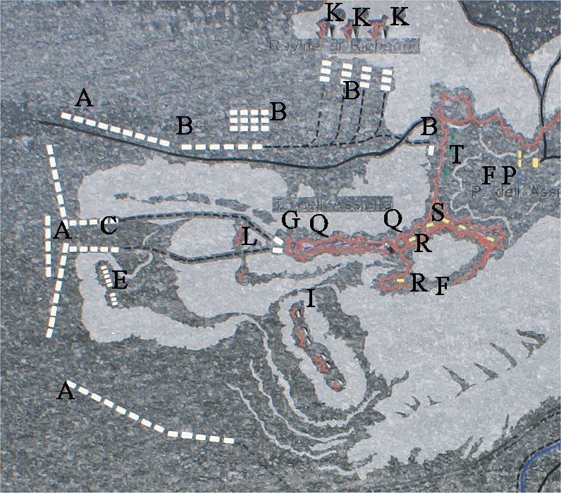 The satellite view should help make the terrain more clear. Many of the entrenchments are visible. |