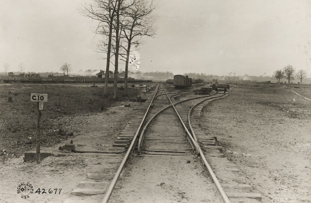 Narrow gauge railroad repaired by engineers after being blown up by the
