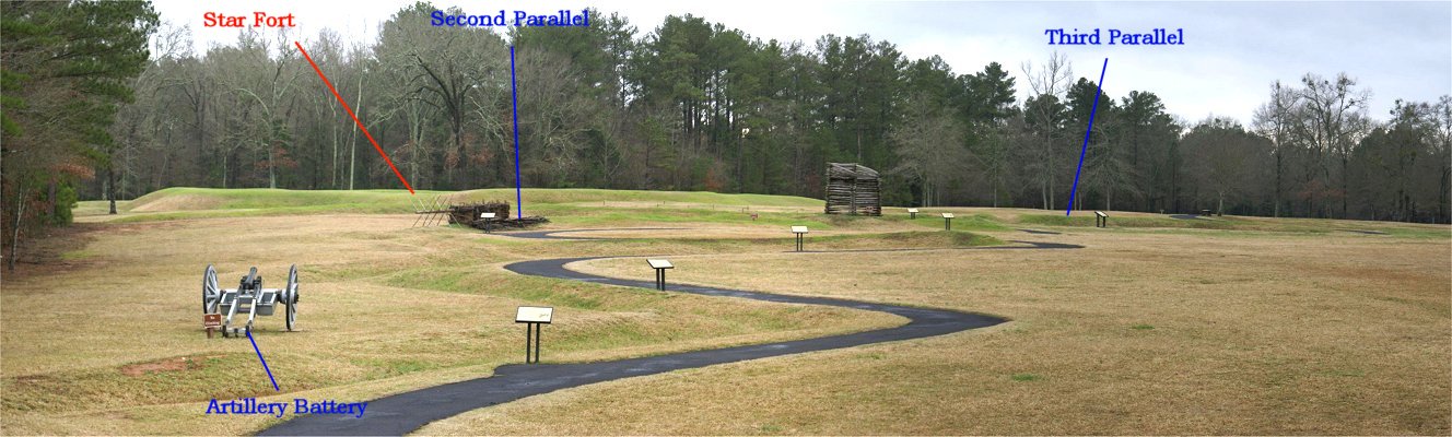 | The town of Ninety Six itself was protected by a palisade, ditch, and abatis. (See park service illustration at right.) The main obstacles to attack the town, however, were two outworks, the Star Fort, positioned to cover the town palisade, and another fort which helped protect the water supply. | ![]() |