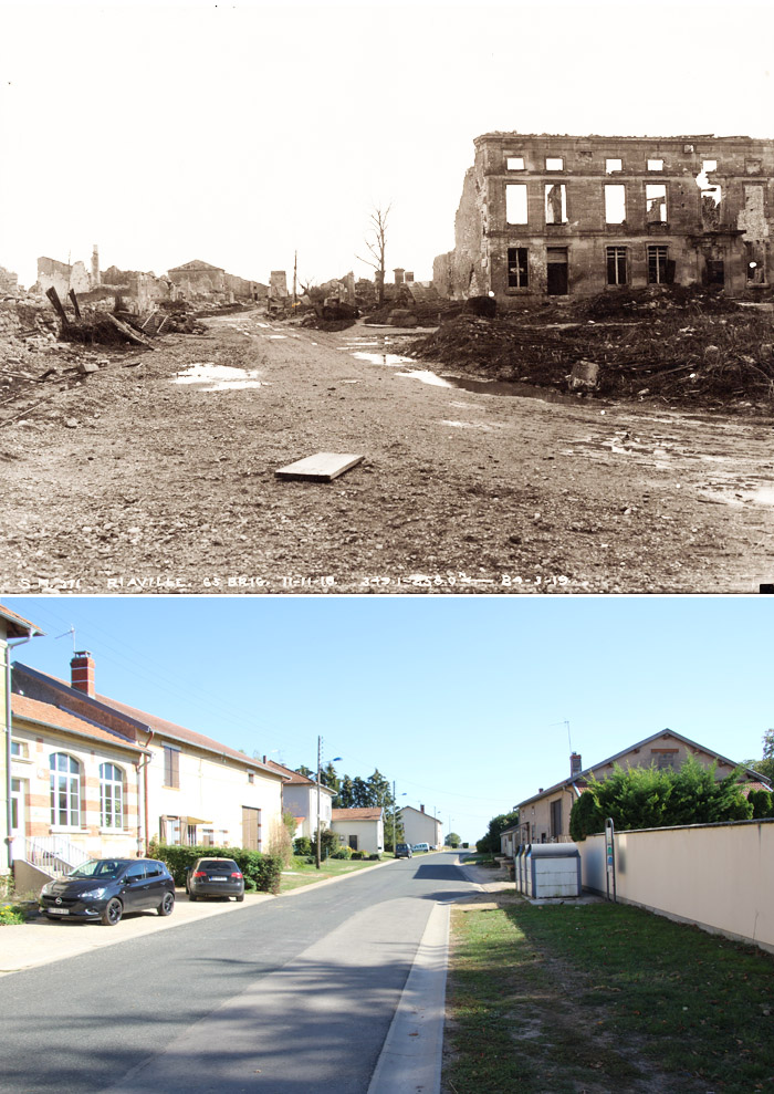 | On the eastern edge of Maneulles is a monument to the 4th Division at the place of its furtherest advance. Maneulles is on the left of the panorams, with a road forking to Fresnes. |