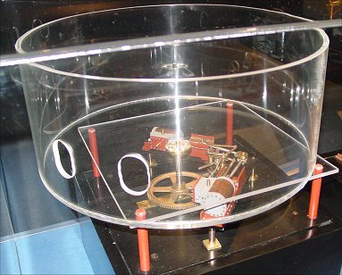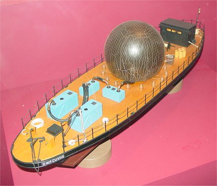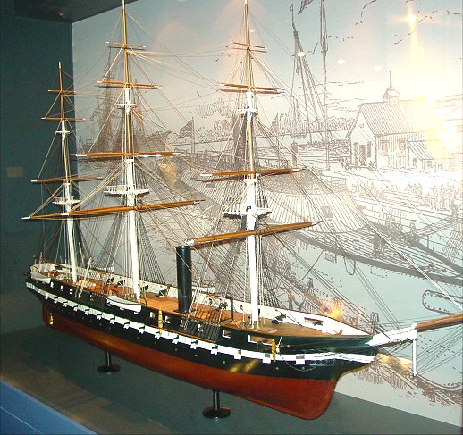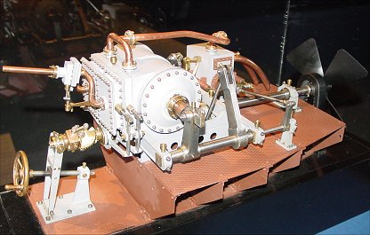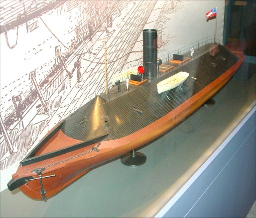 John Ericsson, a native Swede, had been building and testing another ironclad in New York for the Union navy which had a single revolving turret mounting two 11 inch Dahlgren guns. The models above, below, and to the right are in the Mariner's Museum. On the right is the ship's steam engine, a two-cylinder vibrating lever engine, which was entirely below the waterline. The turret could be turned completely around in two minutes powered by two small steam engines. |