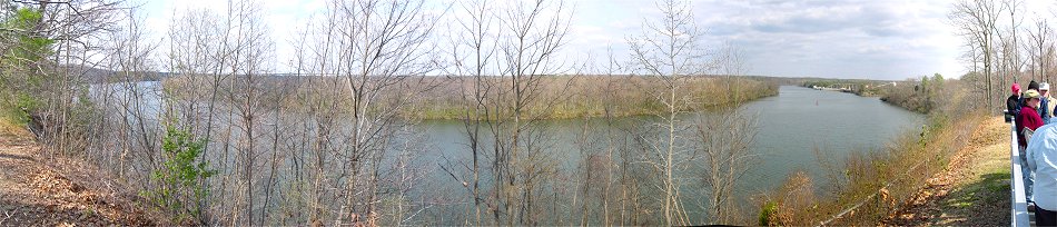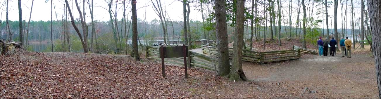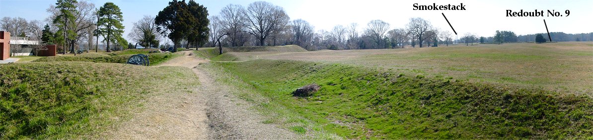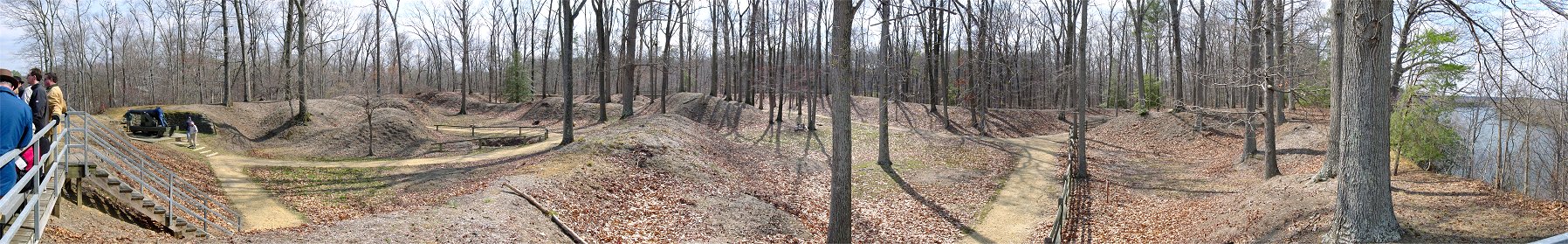 The Union Navy was now able to advance on Richmond up the James River. This was easy along the river's wider parts, but grew more difficult farther up the river. At Drewry's Bluff, seven miles downriver from Richmond, the Confederates had constructed Fort Darling with heavy guns in a commanding position 90 feet above the James. (In this panorama, the fenced-off sunken area is a collapsed bombproof.)