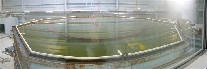 The turret is being stored upside down in the large tank, while the engine is in another tank. In the photo, you can see the bottom of the cylindrical turret.