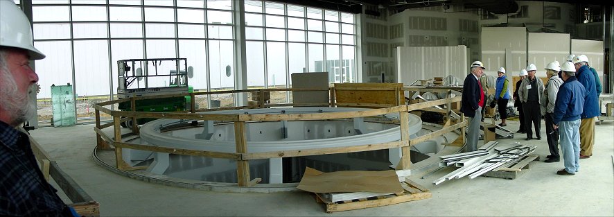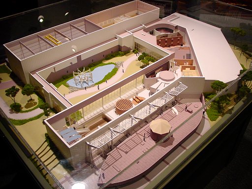 This model shows the area of the Mariner's Museum now under construction. ( - in 2006. It should be completed.) The turret and engine are being preserved in tanks in the distant rectangular building. A full-sized model of the Monitor is being built outdoors, and a mock-up of the turret will be in the adjacent section of the building. See the picture below. On the wall beyond the glass in the picture below, the CSS Virginia will be painted.