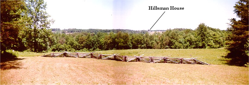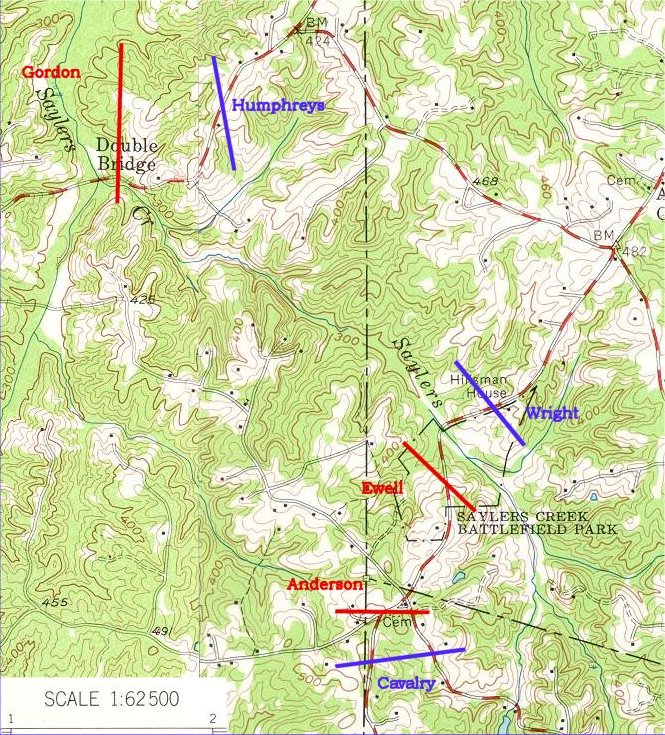 Wright deployed the 10,000 men of the VI Corps along this ridge near the Hillsman House. In the distance, Ewell was deploying his 3,600 along a parallel ridge beyond Saylor's Creek. At about 5:30PM, after a half hour bombardment, the VI Corps advanced.