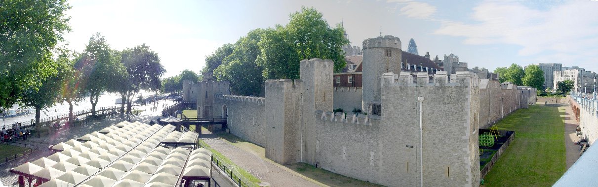 Looking west along outer wall from near Traitors Gate. The southeast tourist entrance is visible below the Tudor architecture. Bell Tower in the center of the picture is the southeastern corner of the inner walls and is capped by a white structure holding a curfew bell.